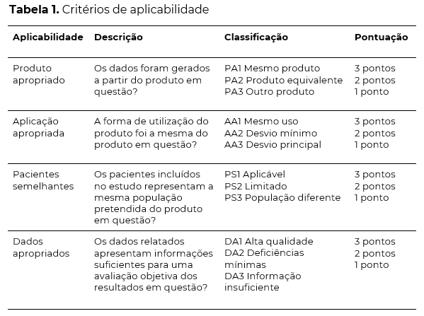 Portanto, para a avaliação de aplicabilidade várias características dos artigos são analisadas, incluindo pacientes semelhantes, produto, aplicação e dados apropriados. Somado a isso, os estudos também são classificados em relevância clínica, de acordo com sua fonte de dados, seus resultados, acompanhamento, significado estatístico e clínico.