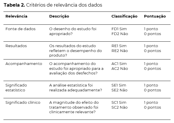 Após a criteriosa seleção dos estudos a serem incluídos no relatório, o próximo passo se trata da análise de relevância e aplicabilidade. Essa avaliação é importante pois a incerteza pode surgir de duas fontes: a qualidade metodológica e a relevância dos dados para a avaliação do dispositivo em relação aos diferentes aspectos de sua finalidade pretendida. Ambas as fontes de incerteza devem ser analisadas para determinar uma ponderação para cada conjunto de dados.